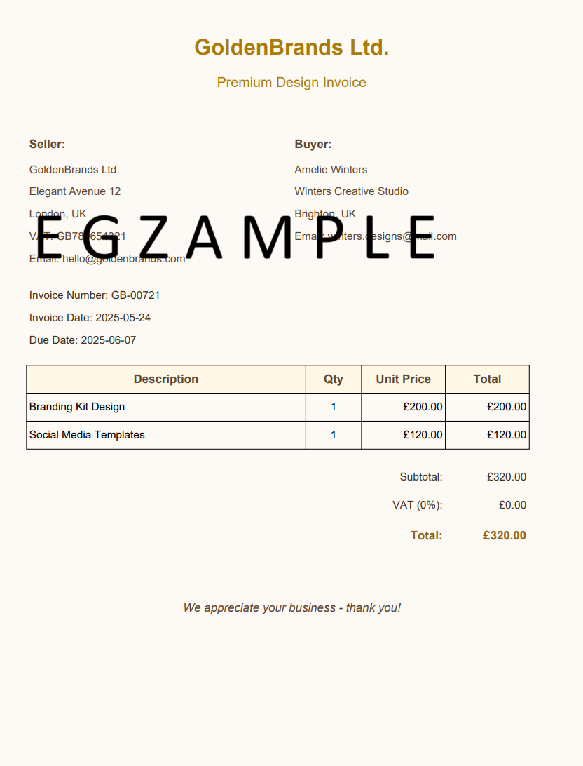 Bring a sense of sophistication to your billing process with the Clean Cream & Gold Invoice Template – a minimalist, high-end design tailored for creative professionals, boutique brands, and elegant service providers.